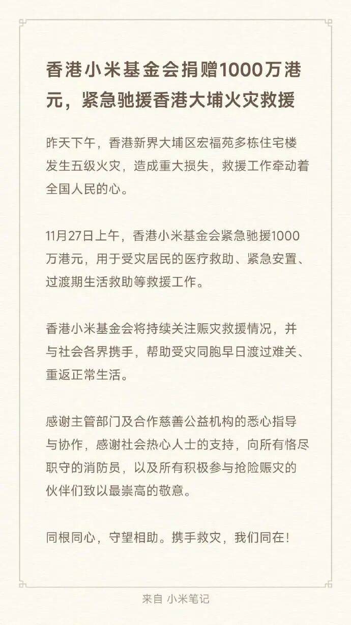 27日,@小米公司发文称香港小米基金会捐赠1000万港元,紧急驰援香港大埔火灾救援,全文如下: