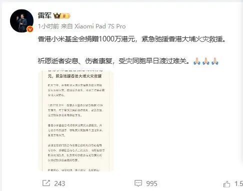 @小米公益基金会,香港小米基金会捐赠1000万港元,紧急驰援香港大埔火灾救援。雷军转发:祈愿逝者安息、伤者康复,受灾同胞早日渡过难关。