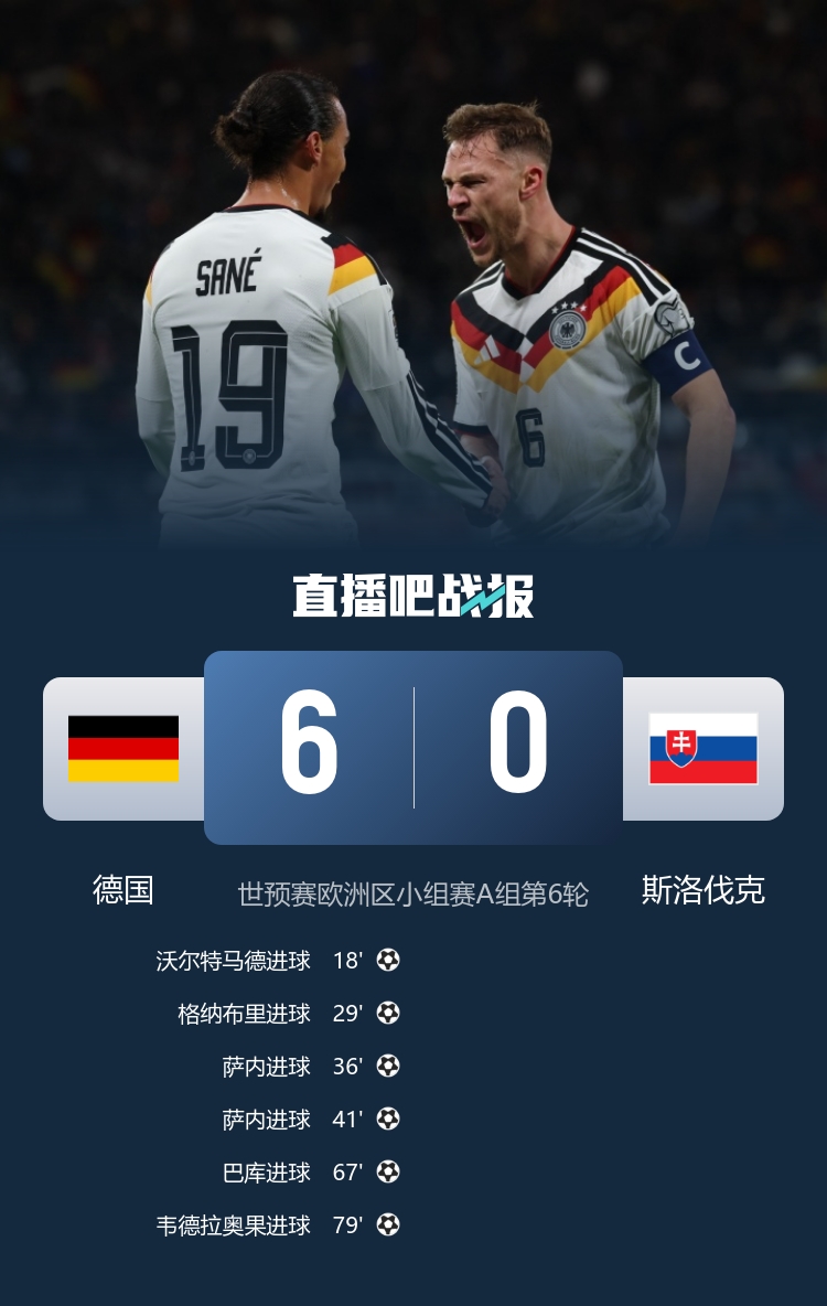 直播吧11月18日讯 北京时间3:45,世预赛欧洲区小组赛A组第6轮德国 - 斯洛伐克。上半场,基米希助攻沃尔特马德连场破门!格雷茨卡助攻格纳布里扩大领先优势;随后5分钟内维尔茨两度助攻萨内。下半场,格纳布里帮助巴库再下一城!萨内助攻韦德拉奥果建功。最终,德国队主场6-0横扫斯洛伐克,小组头名晋级美加墨世界杯!